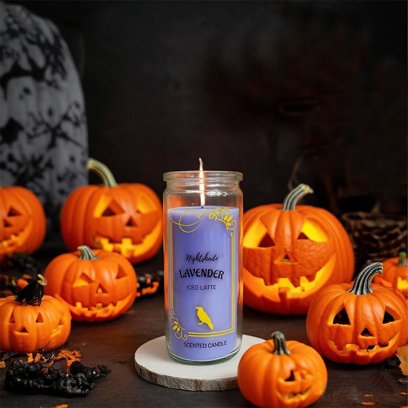Diese Duftkerze basiert auf natürlichem Sojawachs und ist daher umweltfreundlich und gesund. Es hat einen Durchmesser von 6,3 cm, eine Höhe von 14 cm und ein Nettogewicht von 240 Gramm. In einem Glasgefäß untergebracht und mit Farben zum Thema Halloween kombiniert, sorgt es für eine starke visuelle Wirkung.