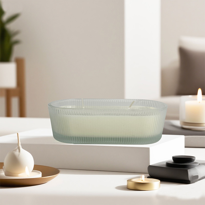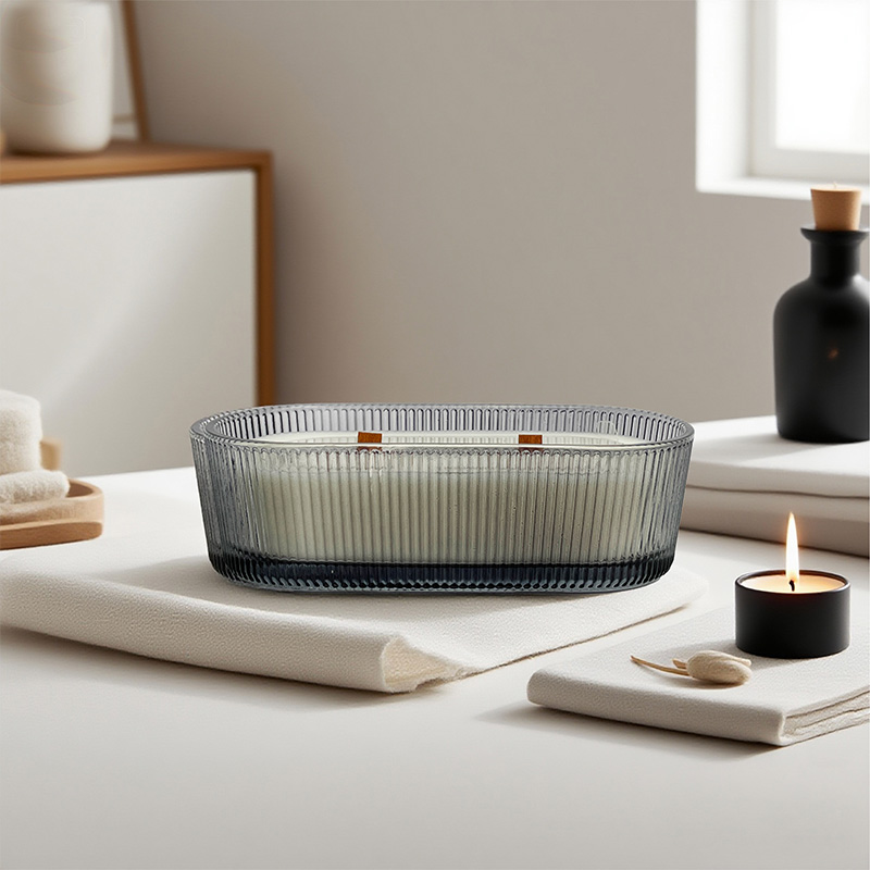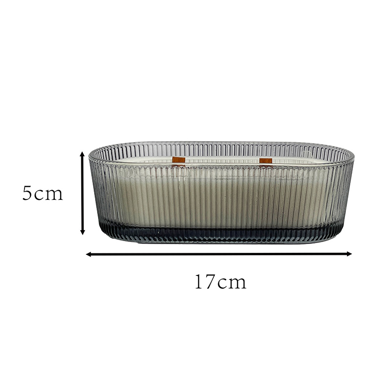 Diese Duftkerze verfügt über ein bootförmiges Design und einfache vertikale Streifendetails, die sich auf die inhärente Schönheit der Produktform konzentrieren. Gefüllt mit 100 % natürlichem Sojawachs ist es umweltfreundlich und gesund. Die Kerze hat ein Nettogewicht von 243 Gramm, mit Abmessungen von 17 cm Länge und 5 cm Höhe. Untergebracht in einem bootförmigen Glasgefäß, erzeugt seine schlanke Form gepaart mit vertikalen Streifen ein starkes Liniengefühl. Mit seinem modernen und minimalistischen Stil dient es als Wohndekor mit ausgeprägter skulpturaler Anziehungskraft.