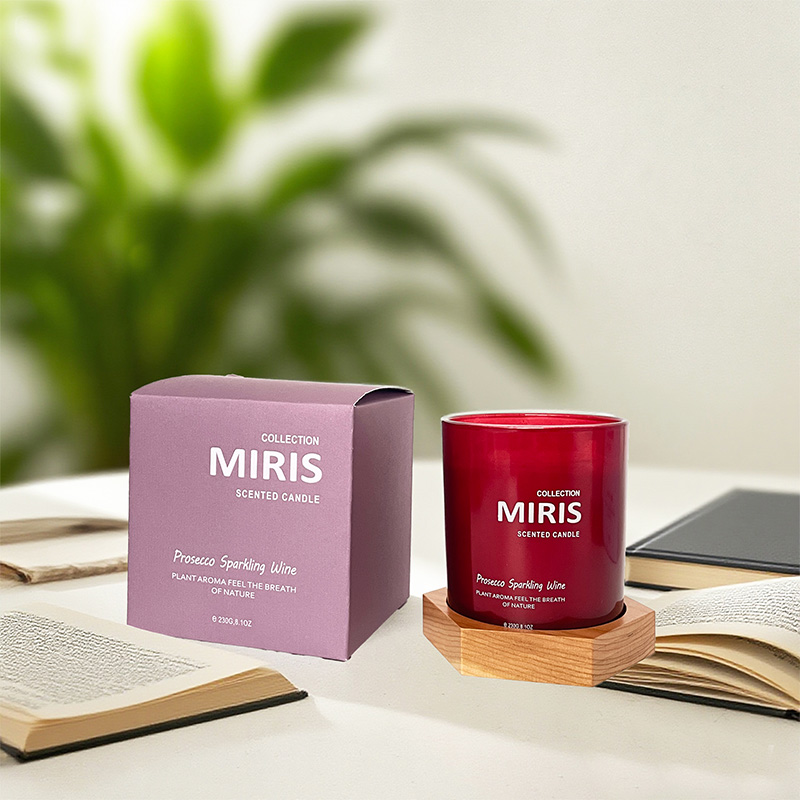 Farbiges bedrucktes Glas mit Holzsockel, Duftkerze, Sojawachs, individuelles Logo