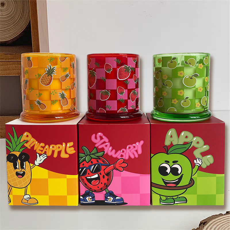 Farbiges bedrucktes Glas mit Holzsockel, Duftkerze, Sojawachs, individuelles Logo