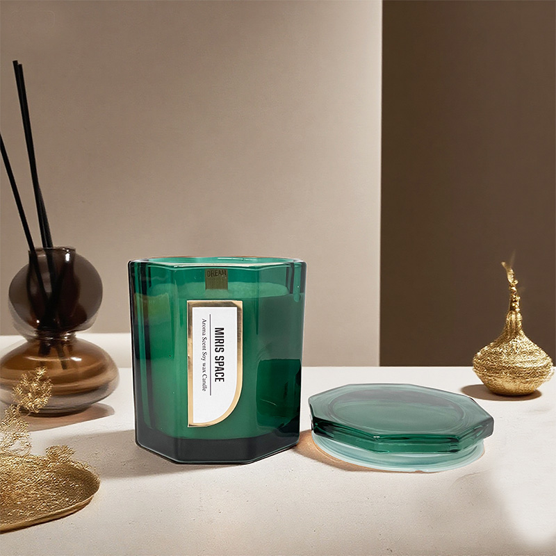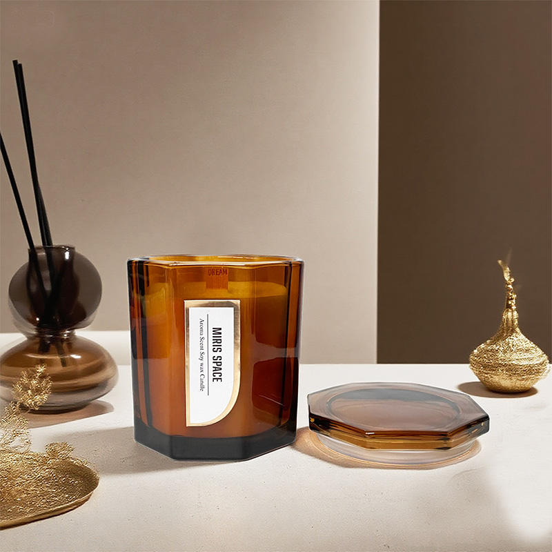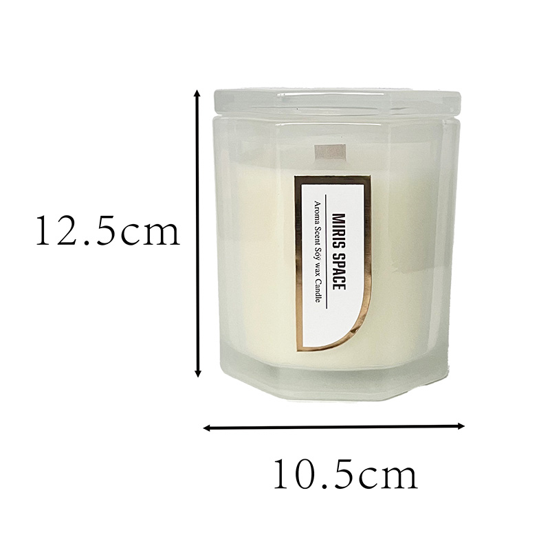 Diese Duftkerze unterstreicht eine einzigartige achteckige geometrische Form und minimalistische Goldfolienverarbeitung. Es ist innen mit natürlichem Sojawachs gefüllt und verkörpert eine dezente, aber dennoch hochwertige moderne Ästhetik. Die Kerze hat ein Nettogewicht von 478 Gramm, mit Abmessungen von 10,5 cm Durchmesser und 12,5 cm Höhe. Die einzigartigen Schnittflächen sind in einem achteckigen Glasgefäß untergebracht und brechen bei Beleuchtung charmantes Licht, während das Etikett aus Goldfolie einen zusätzlichen Hauch von Zartheit und Luxus verleiht.