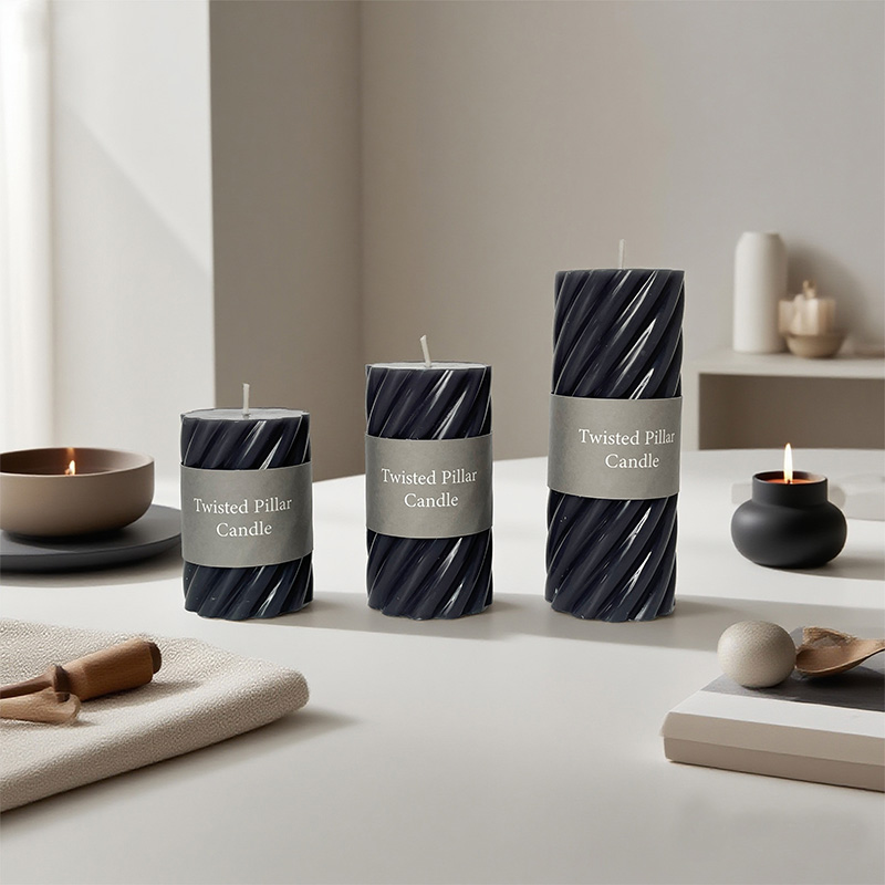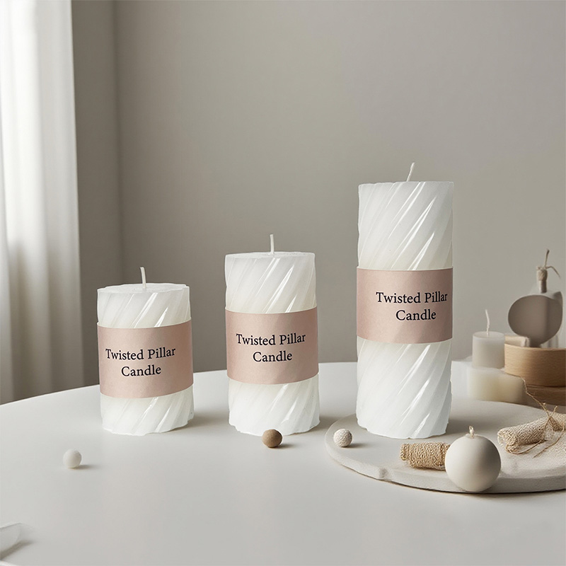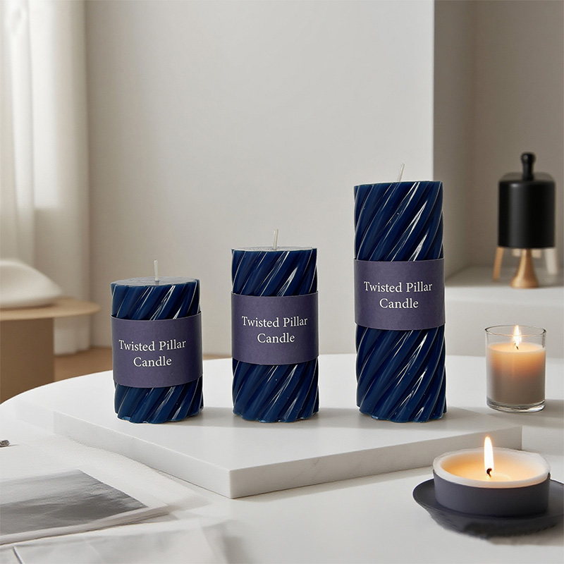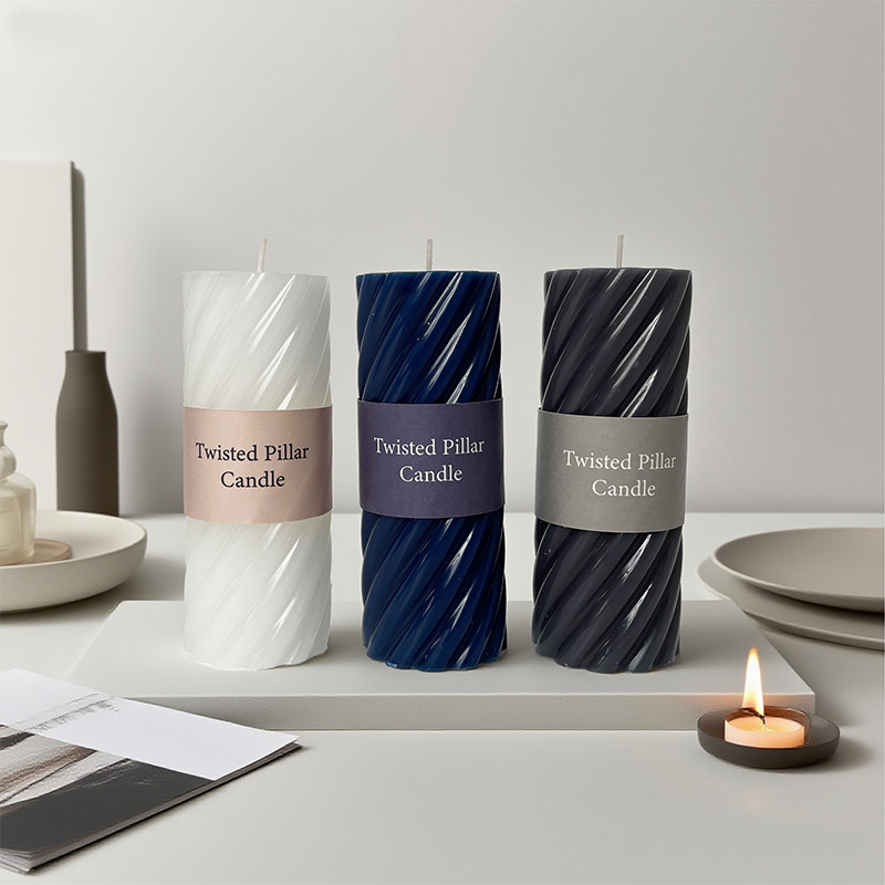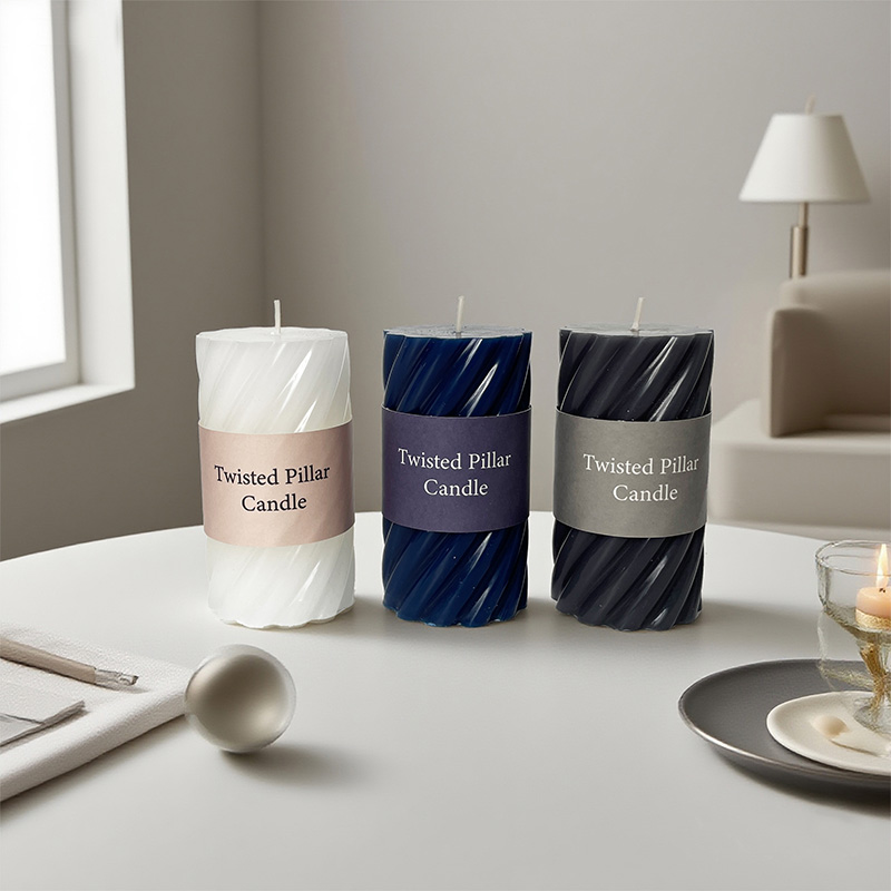 Diese Stumpenkerze verfügt über einen klassischen runden Sockel, der mit einer dynamischen Diagonalschnitttechnik integriert ist, wodurch ihre einfache Form sofort in ein lebendiges Stück mit starkem Design-Appeal verwandelt wird. Es zielt hauptsächlich auf den Großhandels- und Individualisierungsmarkt ab. Das Produkt bietet drei Höhenoptionen: 5,5 cm Durchmesser × 8,2 cm Höhe (Nettogewicht 164 g), 5,5 cm Durchmesser × 10,2 cm Höhe (Nettogewicht 200 g) und 5,5 cm Durchmesser × 14 cm Höhe (Nettogewicht 273 g). Die spiralförmigen oder schrägen Muster verleihen der Kerze eine dynamische Ästhetik, die auch bei statischer Platzierung voller Rhythmus ist.