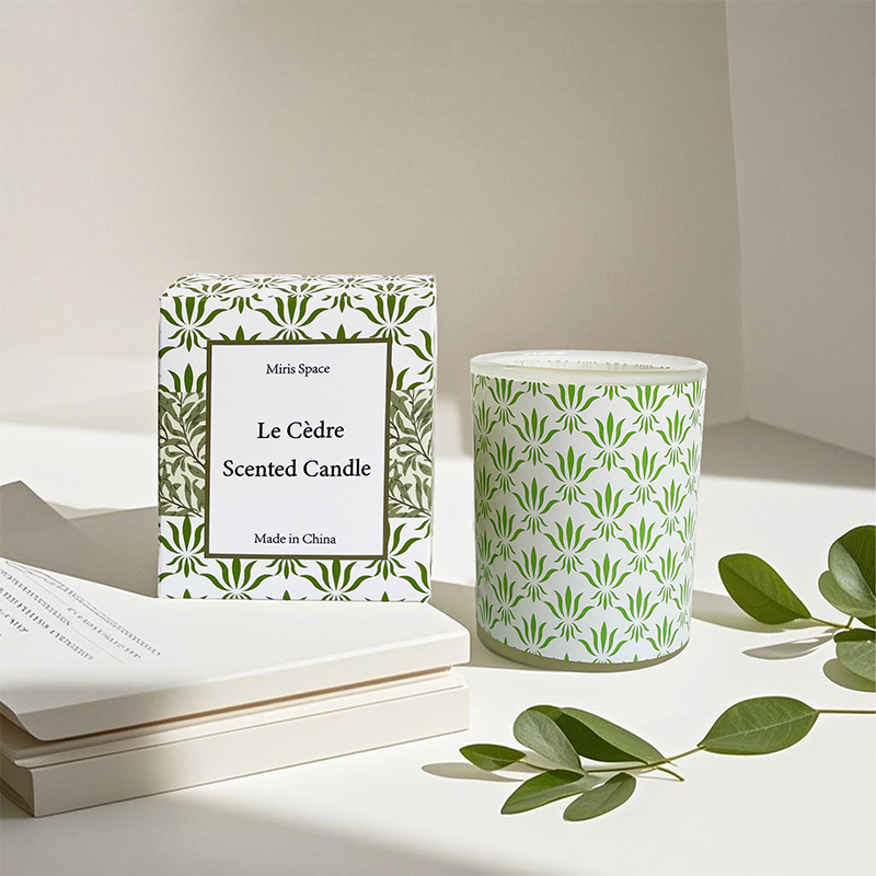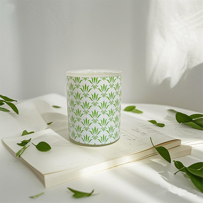 Frische, gemusterte Glasbecher-Duftkerze aus Sojawachs mit grünem Blatt – individuelles Logo
