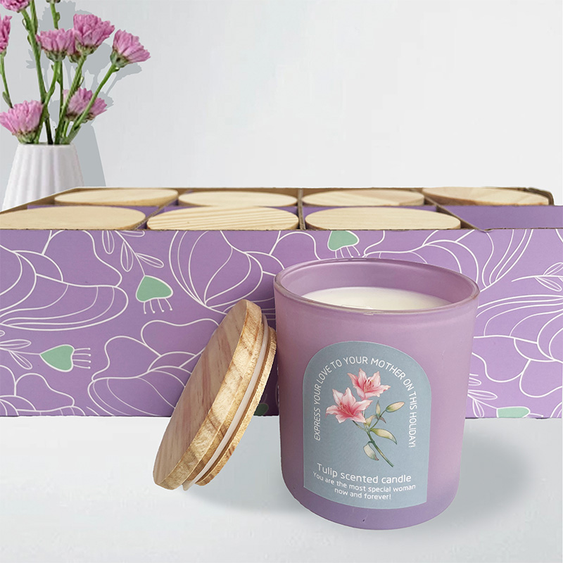 Duftkerzen-Set mit lila Blumen-Holzdeckel – individuelles Logo erhältlich